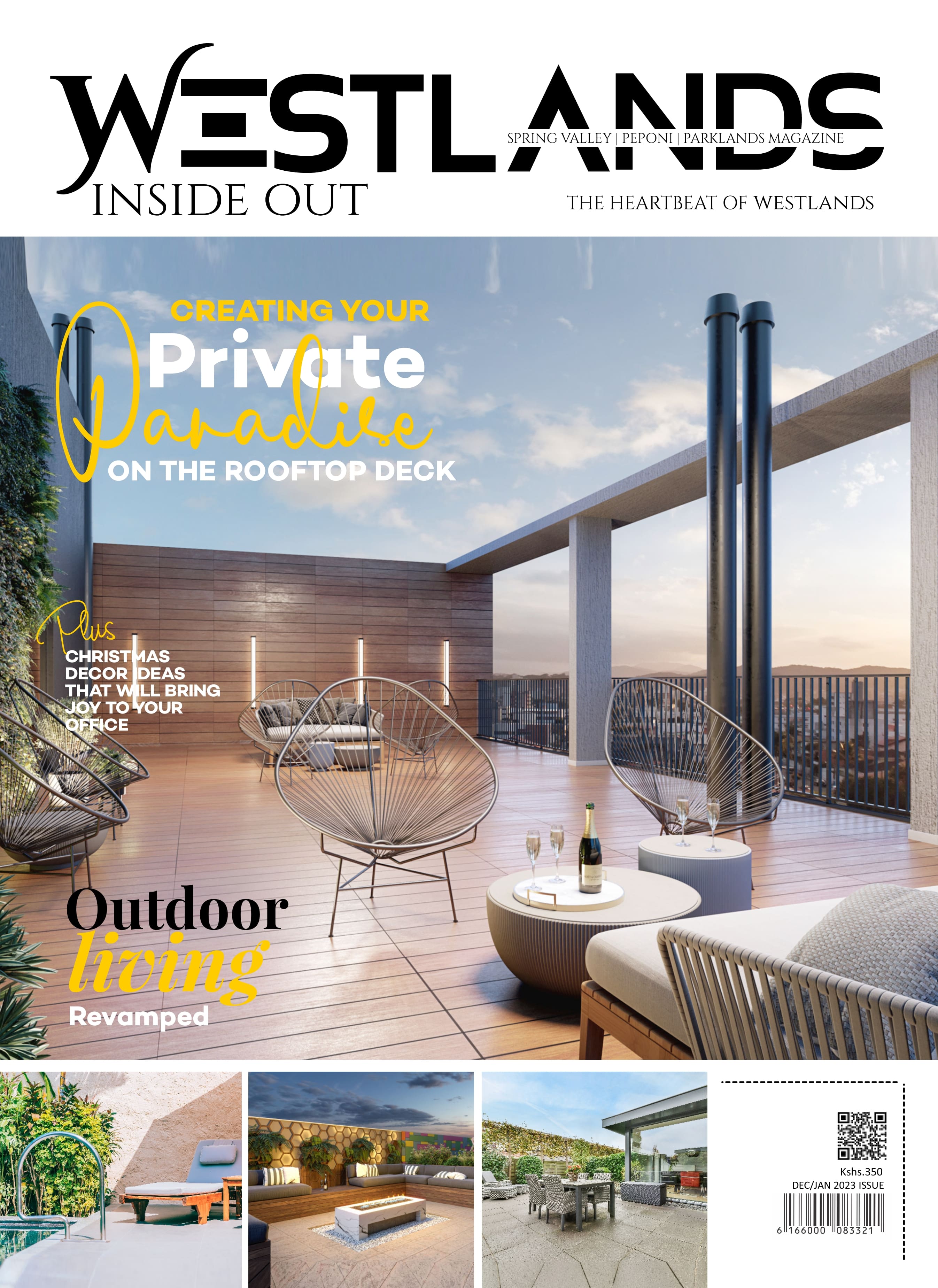 It is a sister publication to hugely successful Lavington Inside Out, Karen Inside Out and Gigiri Inside Out magazines. Westlands Inside Out is a community focused magazine for the people working and/or living in Westlands and her neighbours, keenly exploring areas of interest. The magazine’s most prominent sections include ‘City Guide’, 'New in Westlands', ‘Best Of Westlands’, 'Driven Culture', ‘Luxury’, 'Art and Beyond', ‘Business’, 'Networking', ‘Entertainment’, 'Wine and Dine' and ‘Find it’, which is a mini- directory.